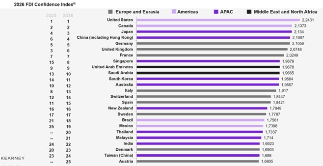 O Conselho de Políticas Globais de Negócios da Kearney acaba de divulgar a edição 2026 do seu Índice de Confiança para Investimento Direto Estrangeiro – 2026 FDICI Confidence Index®. Em sua 28ª edição, o ranking lista os 25 principais destinos de investimento estrangeiro no mundo, analisando o sentimento do investidor em relação aos fluxos futuros de investimento direto estrangeiro. Os Estados Unidos surgem na primeira colocação pelo 14º ano consecutivo, seguido por Canadá (2º) e Japão (3º), que tomou a posição que em 2025 foi ocupada pelo Reino Unido.
