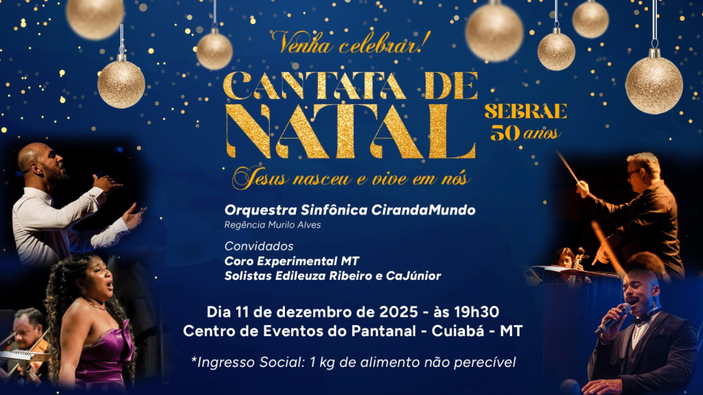 A última ação do ano, alusiva às comemorações de 50 anos de fundação do Serviço de Apoio às Micro e Pequenas Empresas do Estado de Mato Grosso (Sebrae/MT), será a realização da tradicional “Cantata de Natal”, no dia 11 de dezembro (quinta-feira), às 19h30, no Centro de Eventos do Pantanal (CEP). A entrada será solidária, mediante a doação de 1kg de alimento não perecível.