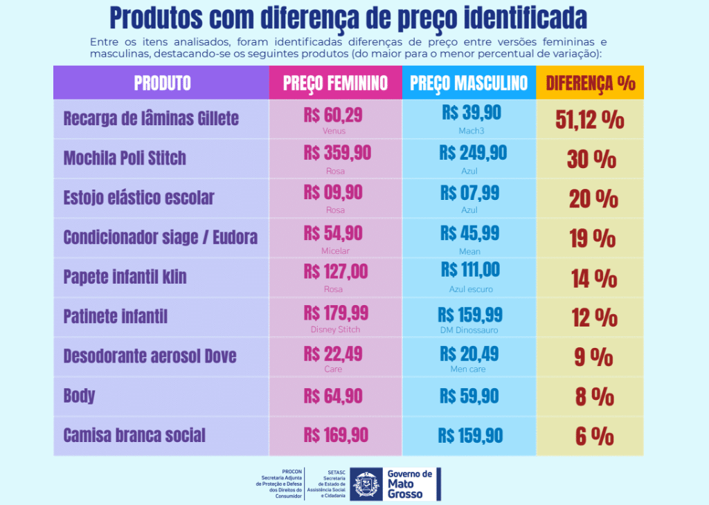 Em ação de monitoramento de preços, a Secretaria Adjunta de Proteção e Defesa dos Direitos do Consumidor (Procon-MT), identificou diferenças de até 50% no valor de produtos equivalentes destinados ao público feminino e masculino.