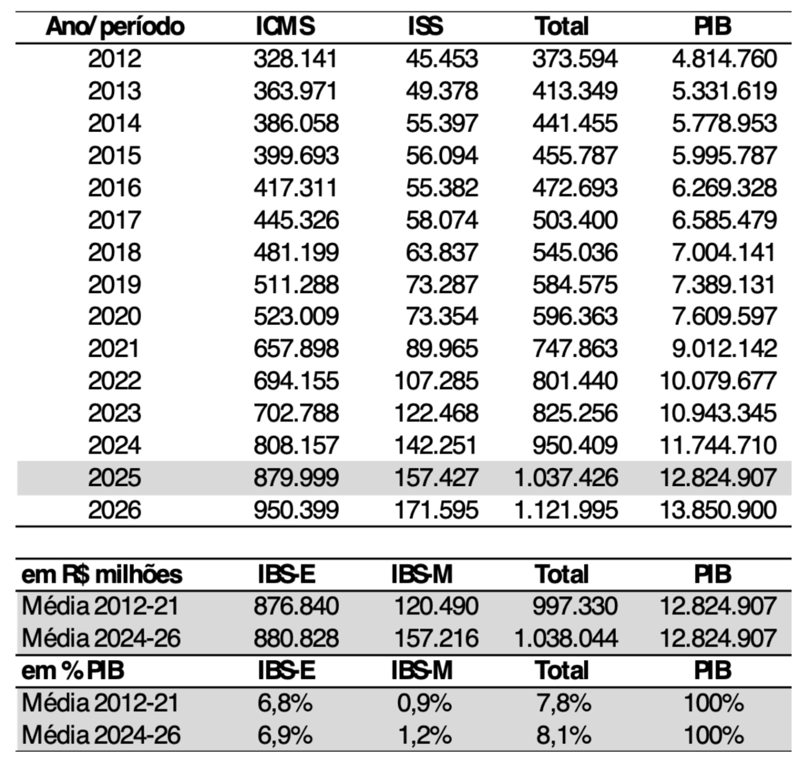 A tabela abaixo mostra os valores arrecadados de ICMS até 2024 e os valores projetados para 2025 e 2026, considerando os resultados já verificados até o primeiro semestre deste ano. Pela média de 2024 a 2026, a receita de IBS deveria atingir R$ 1,03 trilhão, enquanto pela média de 2012 a 2021 o valor seria de apenas R$ 997 bilhões. E quase toda diferença a menor é suportada pelos Municípios, já que a receita média de ICMS não é muito diferente nos dois períodos.